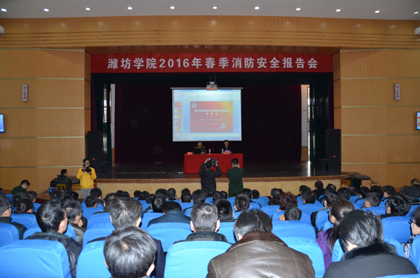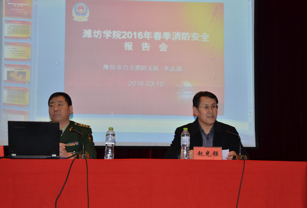 本站讯 3月10日,根据学校工作安排,学校举行2016年春季消防安全报告会并部署近期工作。潍坊市消防支队高级工程师李志强受邀作报告。副校长赵光强主持报告会,他要求进一步增强消防工作的责任感和使命感,努力做到“四个坚持”、树立“两个意识”, 全面检查、迅速整改,确保消防安全工作再上新台阶。