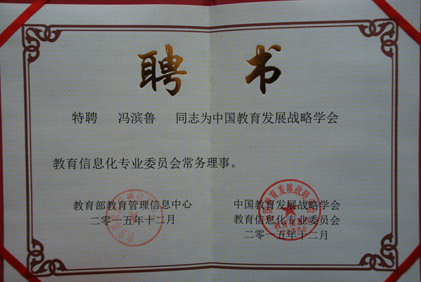 本站讯 日前,教育部教育管理信息中心下发聘书,特聘冯滨鲁教授为中国教育发展战略学会教育信息化专业委员会常务理事。