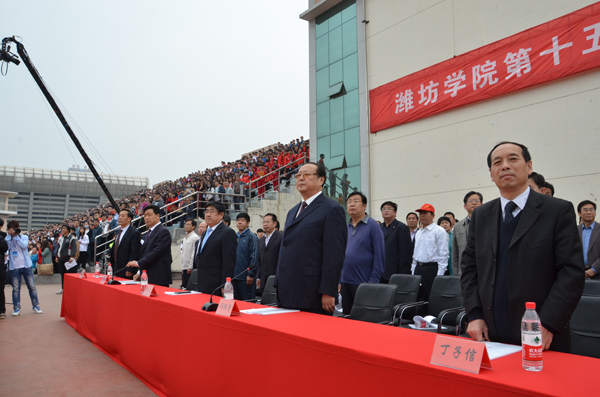 本网讯 4月27日,我校第十五届田径运动会隆重开幕。校领导孙文亮、冯滨鲁、王清明、丁子信、朱猷武出席开幕式。冯滨鲁致开幕词,王清明主持开幕式。各单位、各部门负责同志在主席台就坐。