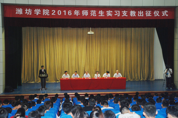 本网讯 9月12日,学校隆重举行2016年师范生实习支教出征仪式,为489名奔赴安丘、临朐教学第一线进行实习支教的学子送行。副校长丁子信、潍坊市教育局副书记胡筱芹、安丘市、临朐县教育局有关负责同志分别在仪式上讲话。潍坊市教育局,安丘市、临朐县教育局有关负责人、教务处、文学与新闻传播学院、外国语学院、数学与信息科学学院、体育学院、教师教育学院有关负责同志、实习支教的带队指导老师和全体实习支教学生参加了仪式。