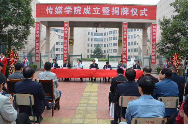 副校长赵光强与潍坊广播影视集团董事长钟耕民先生、山东新影华安文化发展有限公司董事长胥正群先生、中国传媒大学曾志华教授共同为传媒学院揭牌,副校长王旭升主持揭牌仪式。