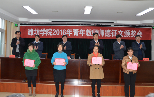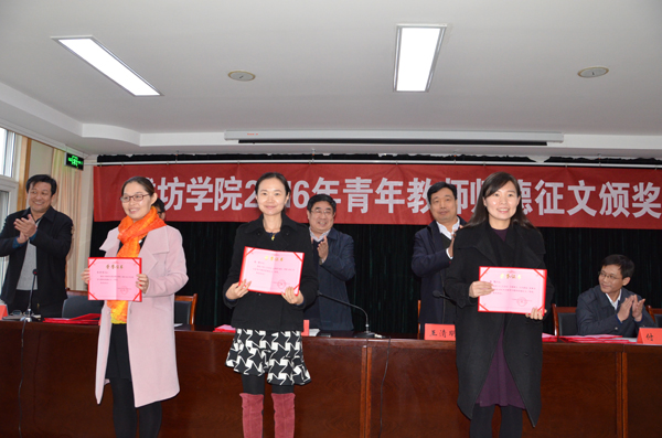 会上,王清明宣读了2016年青年教师师德征文获奖名单。杨婷等10名青年教师分获一、二、三等奖。孙文亮、王清明及党委宣传部、人事处、教务处、工会负责同志共同为获奖教师颁奖。