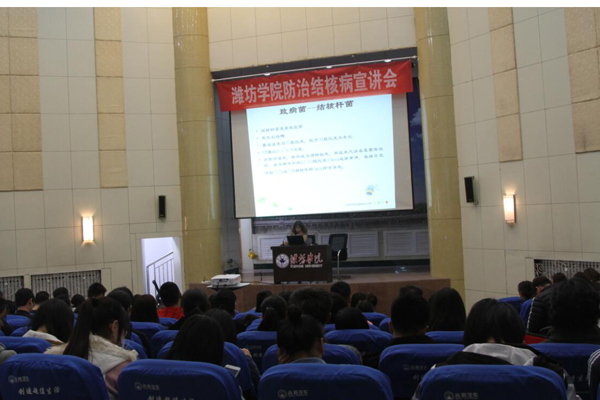 3月16日,学校邀请潍坊市结核病防治中心的两位专家贾江萍、刘学法作了精彩的宣讲报告。3月20日,152名同学在人合楼8222合堂教室举行了大学生控烟、防治结核病知识竞赛。3月23日举行大学生控烟、防治结核病趣味健康夺标赛。3月25日,在第二餐厅前举行世界防治结核病日宣传签名活动。