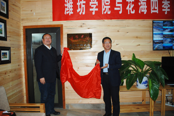 本网讯 3月31日,我校与潍坊花海四季农业开发集团有限公司共建教学实践基地签约揭牌仪式举行。校长冯滨鲁与峡山生态经济发展区管委主任李华刚共同为基地揭牌。生物与农业工程学院负责同志与花海四季农业开发集团有限公司董事长总经理李宪法,共同签署了共建教学实践基地协议。