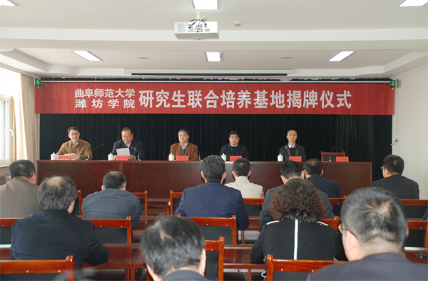 冯滨鲁在致辞中指出,曲阜师范大学、潍坊学院研究生联合培养基地的建立,为我校搭建了更为广阔的合作发展平台,必将促进学校在人才培养、科学研究、社会服务等多方面的实力提升,必将有力推动学校学科建设、科研水平和研究生培养质量的进一步提高,必将对我们实现省内同类高校一流、优势特色突出的综合类应用型大学的目标产生积极而深远的影响。他表示,我校将以基地揭牌为契机,严格按照研究生联合培养基地建设要求,不断加强师资队伍建设,特别是导师队伍建设,尽最大努力为联合培养研究生提供优质的教育资源,努力完成研究生联合培养任务,确保研究生培养质量。