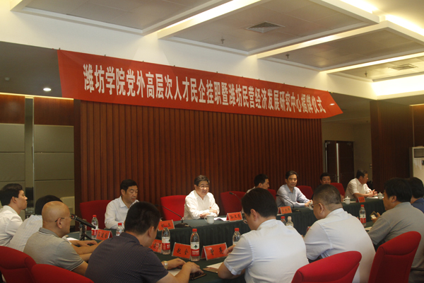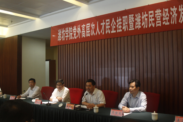 王兆辉在讲话中指出,民营经济对全市经济影响巨大,学校成立“潍坊民营经济发展研究中心”、与市工商联签订“校企联姻协议”、组织党外高层次人才到企业挂职,这几件事做的非常好,对潍坊经济发展、高校教育教学改革、应用型人才培养工作都有很大促进,市委对此高度重视、完全同意、全力支持。他说,潍坊学院是潍坊的大学,要求民营企业充分认识高校对企业智力支持的人才优势,主动联姻,促进企业创新发展。高校也要把研究潍坊经济社会发展作为自己的责任,在“四个城市”建设中发挥作用,做出突出贡献。