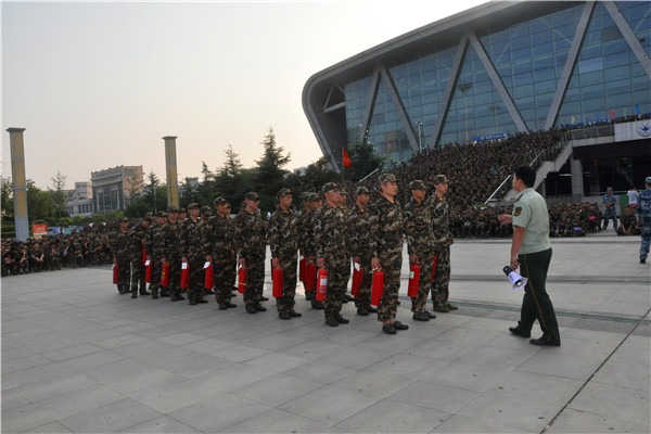 安全课后,在窦守钊的指导下,三十名新生代表在体育馆外的广场上进行了消防灭火实战教学演习,现场演示了消防栓的操作方法。