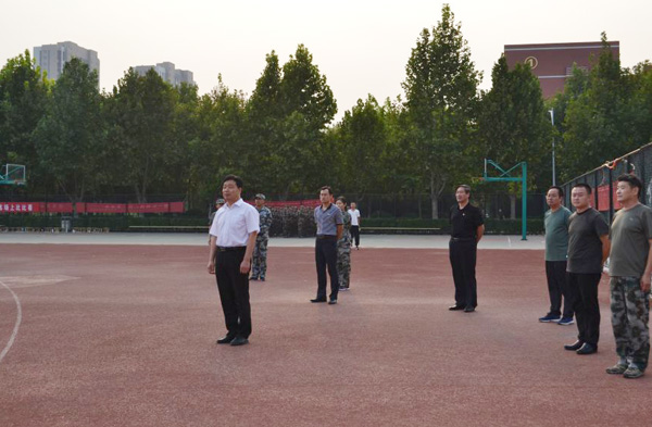 军训教官领队王杰勋中校向王清明报告军训情况后,王清明和教官亲切交谈,详细询问学生的反应及军训相关保障等情况。