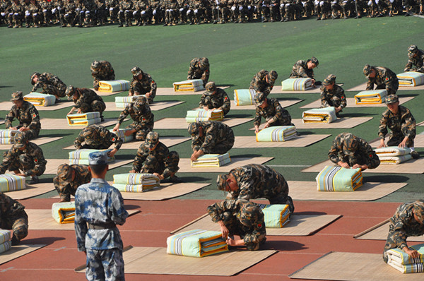 升国旗仪式后,首先汇报的是“分列式”,2017级新生军训方队依次迈着整齐的步伐通过主席台。之后,他们进行了正规化养成动作、内务整理——叠被子、单队列动作表演及军体拳等表演。
