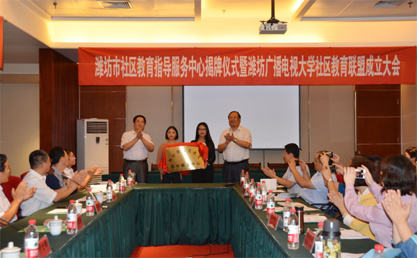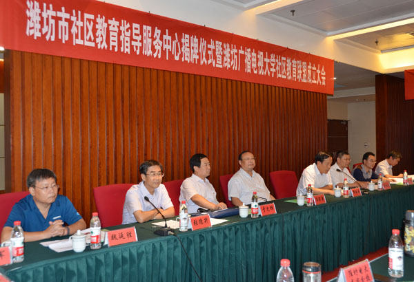 本网讯 9月27日,潍坊市社区教育指导服务中心揭牌仪式暨潍坊广播电视大学社区教育联盟成立会议在我校体育馆举行。校长冯滨鲁、潍坊市教育局副局长于允锋出席仪式并为中心揭牌。副校长朱猷武、于允峰在仪式上讲话。潍坊电大校长张德升主持会议。来自全市电大分管社区教育工作的校领导或部门负责人共50余人参加了会议。
