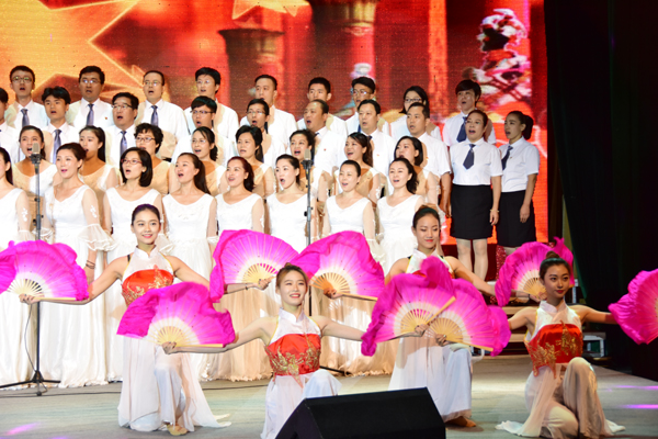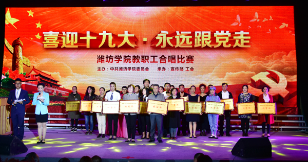 《我的祖国》《走向复兴》《我们走在大路上》一首首以歌颂党、歌颂祖国、歌颂人民为主题耳熟能详的歌曲,充分展现潍坊学院教职工迎接党的十九大胜利召开的喜悦心情和团结奋进、昂扬向上、锐意进取的精神面貌。