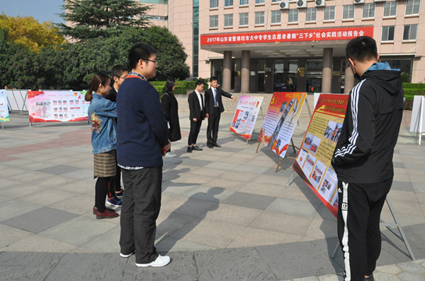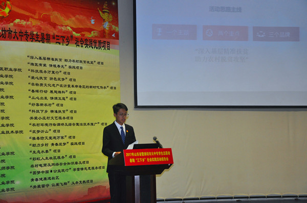会前,与会人员现场参观了潍坊高校“三下乡”社会实践成果展。报告会上,入选潍坊市20个社会实践优质项目团队分别以PPT或视频展示形式进行汇报。随后,现场从20个项目中打分评选出十佳优质服务项目,并对潍坊市十佳优质服务项目、优质指导教师代表、优秀学生代表进行了颁奖表彰。其中我校的“深入基层精准扶贫 助力农村脱贫攻坚”和“禁毒防艾宣传进万家”两项入选十佳。