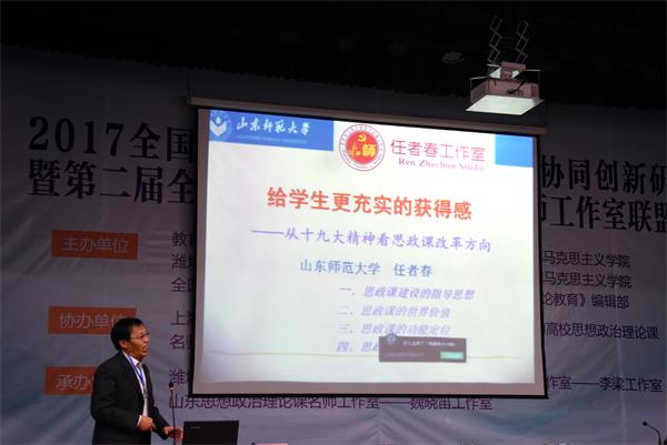 北京名师工作室主持人、北京师范大学马克思主义学院党委书记张润枝教授,山东名师工作室主持人、山东师范大学马克思主义学院任者春教授针对党的十九大精神解读作了主题报告;上海名师工作室主持人、上海海洋大学马克思主义学院院长董玉来教授,天津名师工作室主持人、天津工业大学马克思主义学院院长张健华教授,重庆邮电大学马克思主义学院副院长郑洁教授就党的十九大精神“三进”问题作了专题报告。武汉大学马克思主义学院院长朱喆教授、上海大学教务处副处长顾晓英教授、天津师范大学马克思主义学院副院长李朝阳教授等诸多专家学者围绕教学内容、教学手段、教学方法、教学机构、教师队伍、多学科专业、教学管理、教学制度、教学主体等方面的协同创新,以及如何提升思想政治理论课课堂教学的吸引力、感染力、说服力、针对性、实效性和创新性等问题谈了各自的看法和认识。中央民族大学马克思主义学院院长孙英教授作大会总结。