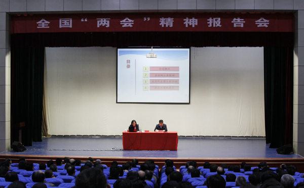 本网讯  4月4日,学校召开全国两会精神学习报告会。全国人大代表、潍坊市总工会副主席、山东鸢都英合律师事务所主任高明芹全国两会精神传达报告。校党委书记孙文亮主持报告会。校领导冯滨鲁、王清明、丁子信、马茜华出席报告会。