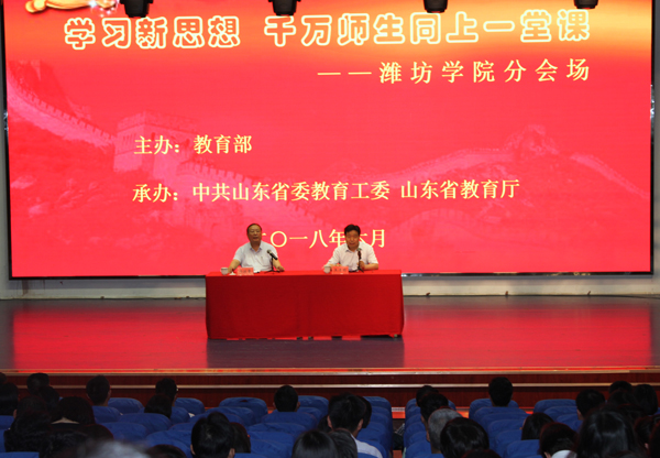 为深入学习宣传贯彻习近平总书记在北京大学师生座谈会和纪念马克思诞辰200周年大会上的重要讲话精神,教育部在全国高校组织开展“学习新思想千万师生同上一堂课”活动,这项活动是深入学习贯彻习近平总书记重要讲话精神的重大举措,是推动习近平新时代中国特色社会主义思想“三进”的关键一招。山东组建了由高校领导、马克思主义理论专家和思政工作骨干参加的“山东高校习近平总书记重要讲话精神讲师团”,我校有五名同志参加讲师团,在潍坊市七所高校进行授课。