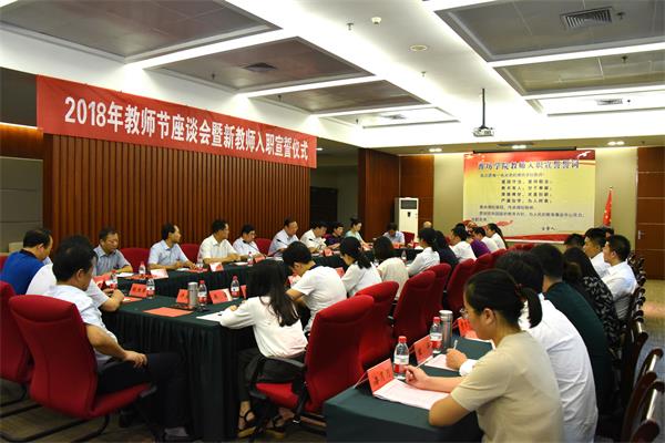 本网讯 9月10日,学校召开庆祝2018年教师节座谈会。25名新进教师庄严宣誓入职。党委书记孙文亮代表学校对全校教职工表示热烈祝贺和亲切慰问,勉励新教师涵养高尚师德,精进治学本领,勇于改革创新,甘于担当奉献。校长冯滨鲁讲话,副校长赵光强主持会议。