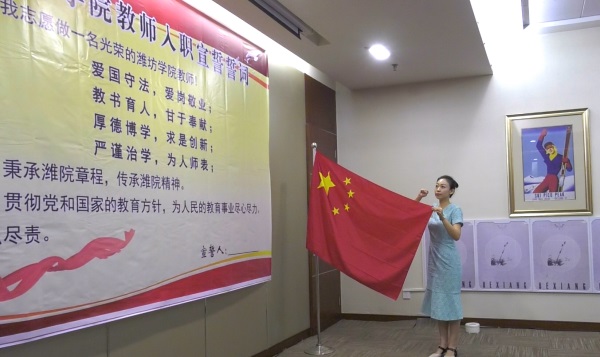 冯滨鲁简要介绍了学校的历史特别是学校近年来取得的成绩,希望大家尽快熟悉环境,融入到学校团结奋进的良好氛围中来。全国青年教师讲课比赛二等奖获得者陈思雨老师带领新入职教师庄严宣誓,发出了爱岗敬业、为人师表的铮铮誓言。