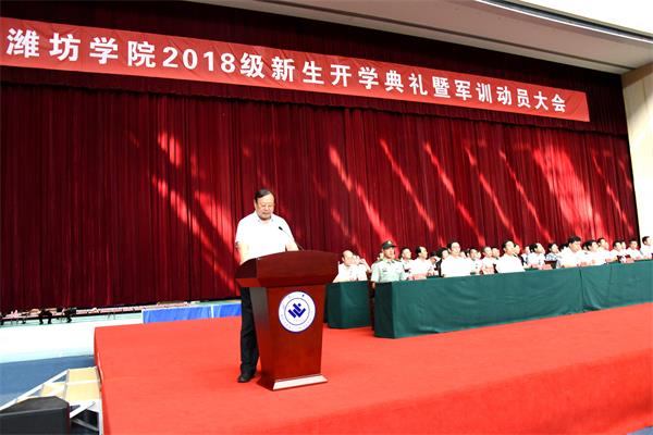 冯滨鲁代表全校师生员工,向来自全国29个省、市、自治区的6000余名新同学表示了祝贺和欢迎,向指导军训工作的部队首长和施训教官,表示敬意和感谢。他简要介绍了学校办学67年来取得的光辉业绩。他说,潍坊学院四个字承载的是一部艰苦奋斗、开拓奋进的创业史,锻造的是一支师德高尚、业务精湛的教师队伍,成就的是一批学业优良、勇于拼搏的优秀学子,更为重要的是她孕育了“和衷共济、艰苦奋斗、追求卓越”的潍院精神。