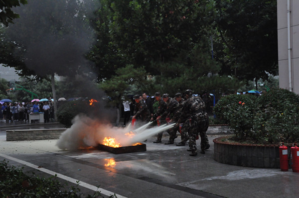 全部安全疏散完毕后,新生进行了灭火实战技能汇报表演。