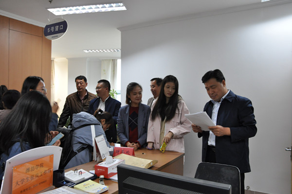 本网讯 10月11日下午,我校2018-2019学年勤工助学岗位招聘会在大学生事务中心如期举行,党委副书记王清明亲临现场,了解各单位用工情况,并与学生亲切交流,解答学生疑问。除各二级学院岗位属自行组织招聘外,学校办公室、财务处、图书馆等10余个管理职能部门参加了招聘活动。