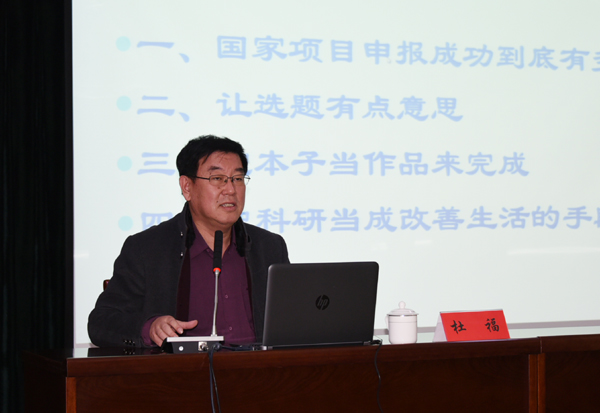 杜福从国家项目的评审程序、选题的价值和意义、申报书的内容和质量、科研工作的重要性等四个方面讲述了人文社科规划项目申报应注意的一些问题。经管学院院长刘鹏表示,杜福的报告高屋建瓴、深入浅出,内涵丰富、分析透彻,既有经验的总结和深刻感悟,也有对政策的思考和升华提炼,为学校今后社会科学研究工作以及社科项目申报工作指明了方向。