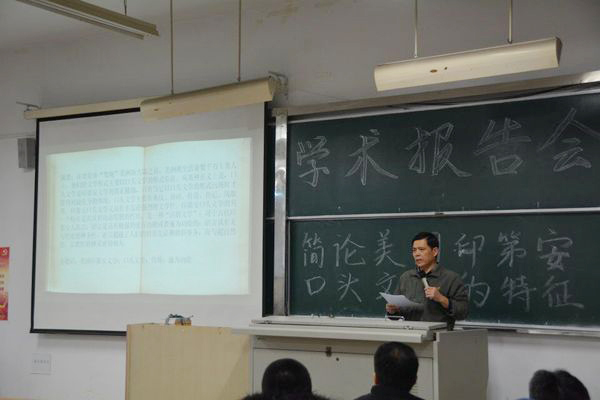 聘任仪式后,生安锋教授为文学与新闻传播学院的师生作了题为“简论美国印第安口头文学的特征”的学术报告。报告中,他介绍了印第安人的历史以及印第安口头文学的内容和发展历程,通过一些知名印第安口头文学作品,对印第安口头文学的基本特征进行了深入阐述。生安锋教授还与学生展开互动,就“文化交流与文化缺失”“文学作品的阶层性和文学性”“研究过程中的资料查询与个人见解”等问题进行了交流。