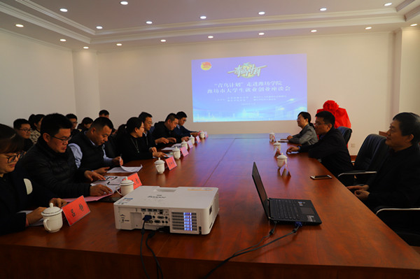 本次座谈会由潍坊市团委、人力资源和社会保障局,潍坊学院招生就业处、团委联合举办。团委和招生就业处相关工作负责同志,部分学院团总支书记、青年教师和学生代表参加会议。