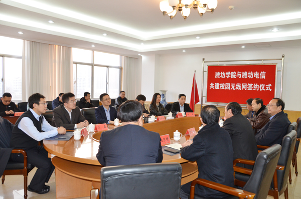 本网讯  1月14日,我校与潍坊电信合作共建校园无线网签约仪式举行。校长冯滨鲁与潍坊电信总经理任永刚代表双方在合作协议上签字。副校长丁子信、潍坊电信副总经理赵长波先后在仪式上讲话。仪式由办公室负责同志主持。