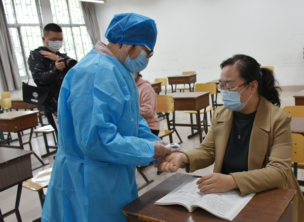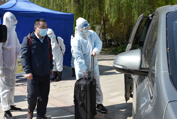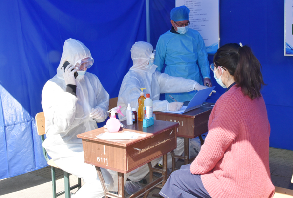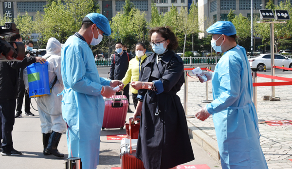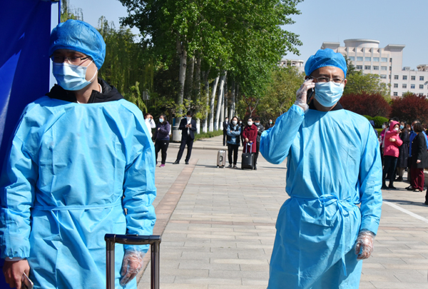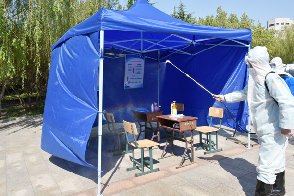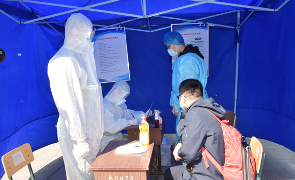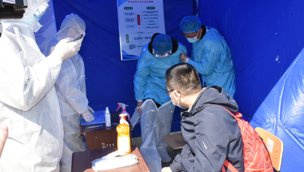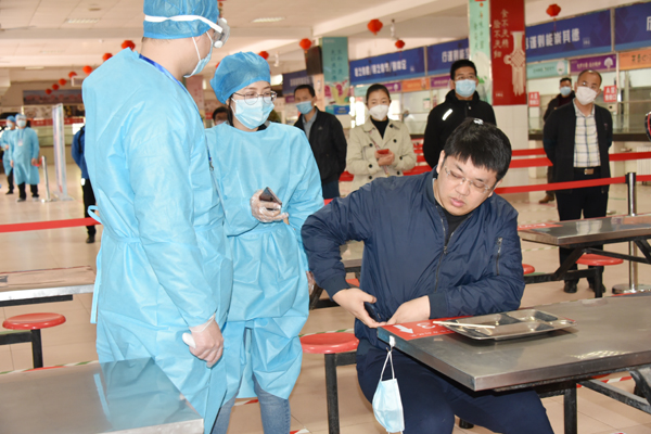在返校报到入口处,学生在校门外沿规划路线间隔2米排队,依次进行体温检测、身份验证、行李消毒。发现体温超过37.3℃的学生,由辅导员将学生送到校门口临时留观点,由校医为其加戴医用口罩、登记相关信息、重测体温,确认体温38℃,立即启动应急处置。校医联系定点医院救护车。同时,学院联络员报告校区负责人。由校医和辅导员协助将学生送至潍坊市第二人民医院发热门诊进一步检查。物业人员将临时留观点彻底通风消毒。
