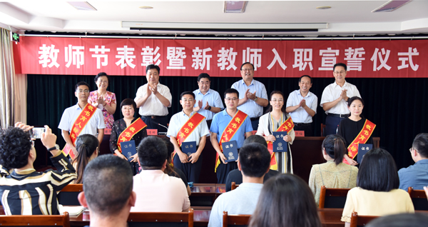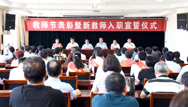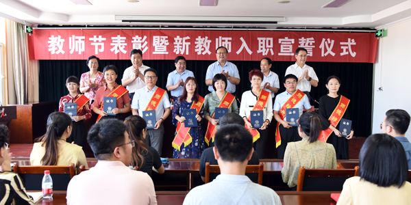 本网讯 9月9日,在第36个教师节到来之际,学校召开会议,表彰评选的师德标兵和教书育人标兵,并组织24名新教师举行庄严的入职宣誓。党委书记孙文亮出席会议,校长冯滨鲁发表讲话,会议由副校长赵光强主持。学校领导王清明、丁子信、马茜华出席会议。