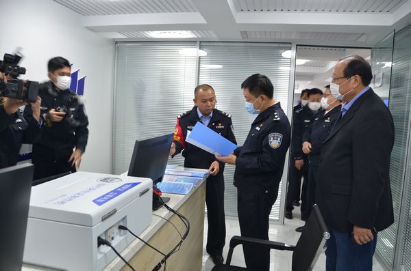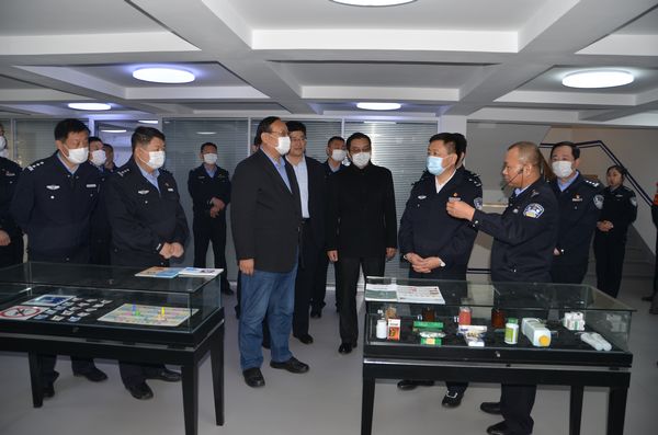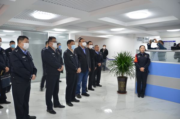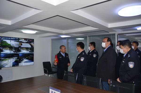 在党委副书记、校长冯滨鲁,副校长王旭升的陪同下,申延军及省公安厅特警总队队长孙健,潍坊市副市长、市公安局党委书记、局长孙刚,市公安局党委委员、副局长张兴业,高新区党工委委员、公安分局党委书记、局长王若水一行实地查看了我校警务中心,详细了解警务中心功能设置、运行机制和人员配置等情况。