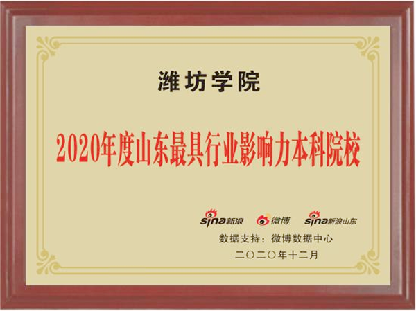 本网讯 近日,2020年度山东教育盛典荣耀榜单盛大发布,潍坊学院荣膺“2020年度山东最具行业影响力本科院校”奖。
