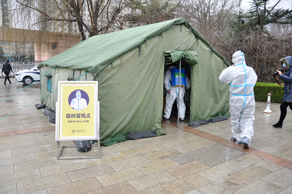 本环节是对在校医院就诊的体温异常学生处置演练。体温异常的学生将被指引至临时留观点,并重测体温、查验健康通行码、查验户籍、询问病史、启动应急处置,最后消杀人员对临时留观点、医院大门口及过道进行通风消毒。