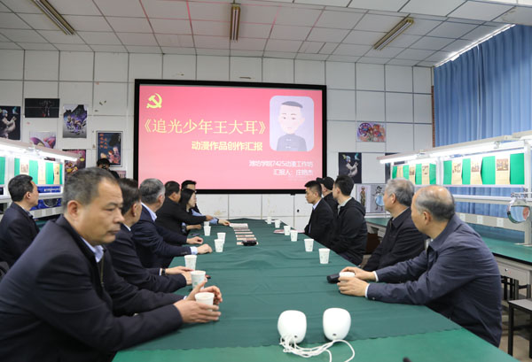 指导组实地查看了学校党史学习教育氛围营造情况。在传媒学院,指导组听取了7425动漫工作坊对纪念中共一大代表王尽美的系列动画微视频《追光少年王大耳》的创作汇报;在美术学院,指导组查看了党史学习教育作品展,了解了党建走廊文化,并对“红色作品我来说”主题团日活动进行了现场指导。