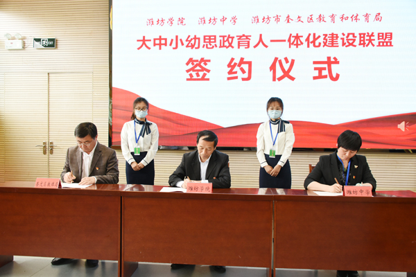 为深入学习贯彻习近平总书记在学校思想政治理论课教师座谈会上的重要讲话精神,坚持用习近平新时代中国特色社会主义思想铸魂育人,统筹推进潍坊市大中小幼思政课一体化建设,潍坊市教育局协调成立大中小幼思政育人一体化建设联盟。该联盟的建立,标志着潍坊市大中小幼思政育人一体化建设正式启动。接下来,联盟平台将协调组织签约各方,通过搭建多层次、多渠道的交流合作平台,充分发挥各个学段的优势特长,在课程建设、教学改革、师资培养、特色创建、资源共享等方面开展一体化建设,打造“螺旋上升、循序渐进”的一体化育人格局,形成优势资源共享、精准发力的良好局面。