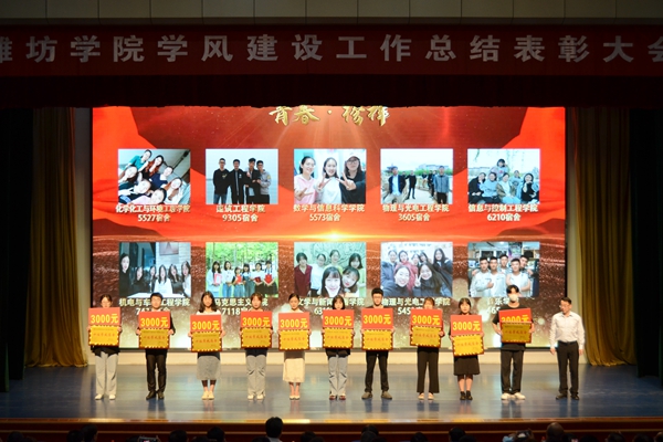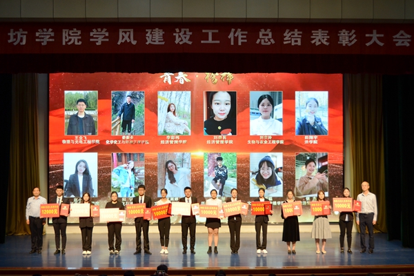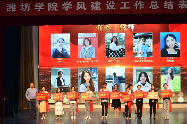 大会总结表彰了在2020年我校学风建设工作中涌现出的先进集体和先进个人,与会领导为“晒福·未来之星”奖学金、“十佳学风宿舍”“十佳学风班级”和“十佳优秀学子”暨“校长奖学金”的获得者以及2020年“考研先进单位”颁奖。“晒福·未来之星”奖学金获得者柴振全 、“十佳学风宿舍”获得者代表梅宇、“十佳学风班级”获得者代表蔺雪、“十佳优秀学子”暨“校长奖学金”获得者李彩祎、考研先进单位代表冯道俊老师依次作交流发言。