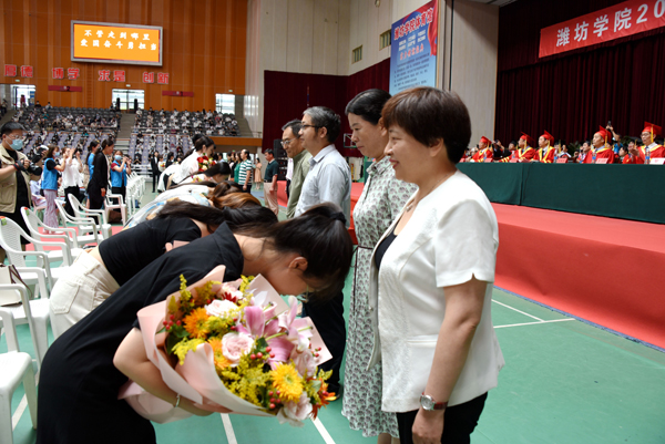 典礼上,学校领导为优秀毕业生代表、西部计划志愿者进行了颁奖。毕业生代表向教师代表献花,以表达全体毕业生对老师们的敬意和感谢。