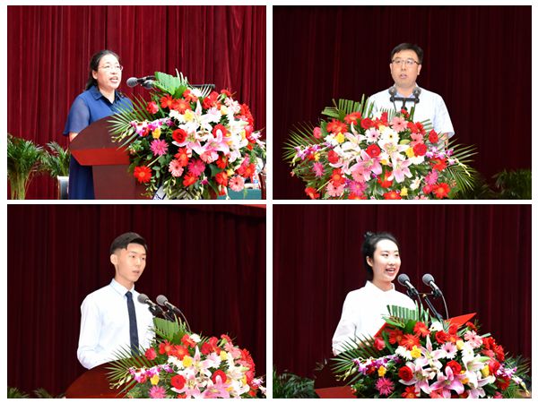 教师代表马克思主义学院楚爱丽老师、优秀校友代表数学与信息科学院学院2004届数学与应用数学专业毕业生、潍坊一中副校长董国森、毕业生代表音乐学院舞蹈学专业许鑫浩同学和在校生代表传媒学院2018级播音主持专业卢玮琪同学分别作了感情真挚的发言。