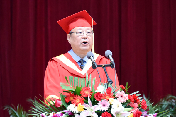 冯滨鲁在讲话中向圆满完成学业的6300余名毕业生表示热烈的祝贺,向立德树人、无私奉献的老师们表示衷心的感谢。他以“逐梦新时代 奋斗新征程”为题,勉励毕业生走出恬静安宁的“象牙塔”,到社会“大熔炉”中去经风沐雨、摔打磨练,努力在这个大有可为的新时代大有作为。他讲到,这既是时代赋予同学们的光荣使命、母校给予的殷切期望,也是同学们对自我价值的追求与向往。他赠言毕业生同学要胸怀理想,在诱惑面前正确选择,涵养家国情怀,守住底线本心,既要“仰望星空”,更要恪守“心中的道德律”,努力做到慎独、慎微、慎初,做一个品德高尚的人;要善待自我,在困难面前学会坚强,磨砺坚强意志,保持积极心态,学会善待他人;要通过学习、奋斗练就高超本领,在责任面前勇于担当,有足够能力去开拓属于自己的一片新天地,以平凡角色写就不凡文章,为国家发展和社会进步贡献力量,与伟大祖国一起谱写最壮美的时代华章。