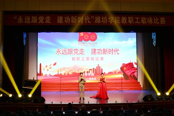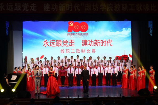 “我们走在大路上,意气风发斗志昂扬,共产党领导革命队伍,披荆斩棘奔向前方……”比赛在《我们走在大路上》的嘹亮歌声中拉开序幕。《东方红》《中国,中国,鲜红的太阳永不落》《山丹丹花开红艳艳》《祖国不会忘记》《走向复兴》一首首耳熟能详、激昂奋进的红歌,经过各个代表队精心编排,搭配领唱、朗诵、伴舞、剧情表演等多种艺术形式,把比赛推上一个又一个高潮。此次参赛作品主要以歌颂党、歌颂祖国、歌颂人民为主题,展现团结奋进、昂扬向上、锐意进取的精神面貌为主旋律,引领全校广大教职员工扎实开展党史学习教育,厚植爱党爱国情怀,展现潍坊学院教职工良好精神风貌,以昂扬姿态奋力开启学校建设高水平应用型大学的新征程。比赛最后,学校党委全体成员登台站在最后一支参赛队伍中,与全体观众一起合唱《没有共产党就没有新中国》,比赛在铿锵有力的歌声中圆满落幕。