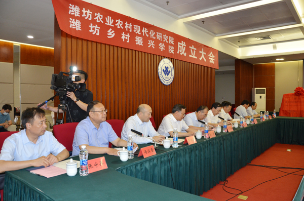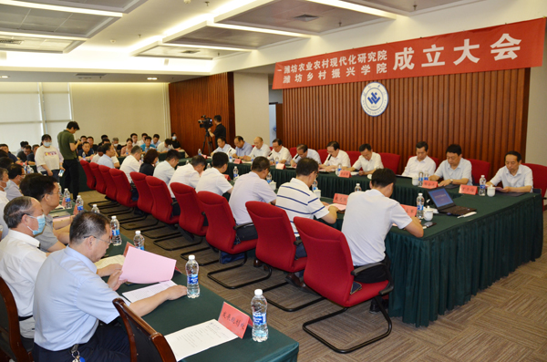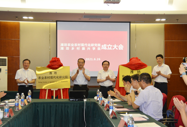 本网讯 6月26日,潍坊农业农村现代化研究院、潍坊乡村振兴学院成立大会在我校举行。潍坊市政府党组副书记、副市长马清民,青岛农业大学副校长赵金山,学校党委书记李东出席大会并致辞。马清民和李东为“潍坊农业农村现代化研究院”揭牌,赵金山和山东省乡村振兴联盟秘书长、山东润德农业开发集团有限公司董事长冯海强为“潍坊乡村振兴学院”揭牌。大会由校长冯滨鲁主持。