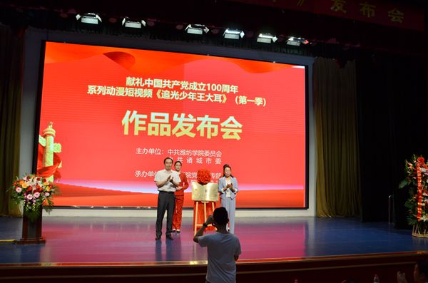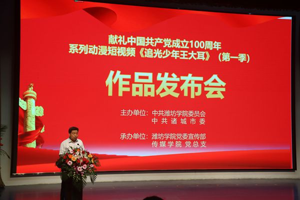 本网讯 由中共潍坊学院委员会、中共诸城市委策划并投资,由我校党员师生承办创作的建党一百周年献礼片——系列动漫短视频《追光少年王大耳》作品发布会,于6月29日上午在潍坊学院图书馆报告厅举行。校党委书记李东、校党委副书记王清明、副校长王旭升、诸城市委宣传部部长赵莉、诸城市委组织部副部长訾青武、诸城市隆嘉文旅集团广告网络部部长刘志京出席大会并共同为《追光少年王大耳》发布,发布会由校党委委员、宣传部长单振涛主持。