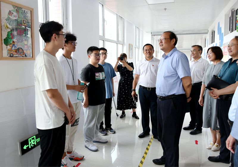在李汉军等的陪同下,冯滨鲁一行调研了坊子区理想小学学校基础教育建设情况。参观了学校的VR教室、纸笔课堂教室、创客教室、云计算机教室等多功能教室。冯滨鲁与我校四位实习学生进行亲切交谈,勉励他们珍惜机会,认真学习,积极工作。