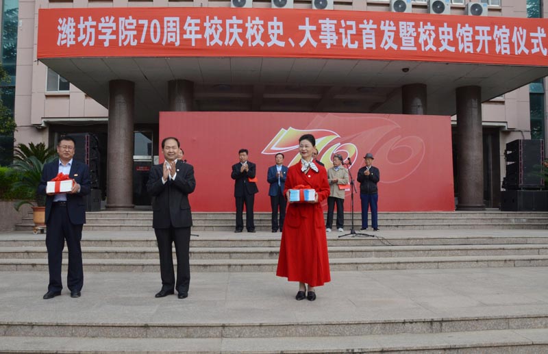 本网讯 10月14日,学校70周年校庆校史、大事记首发暨校史馆开馆仪式在启智广场举行。学校党委书记李东、校长冯滨鲁出席仪式并为校史馆揭牌。党委副书记王清明、原昌潍师专副校长张克云在仪式上致辞。副校长朱猷武主持仪式。原潍坊职业大学、潍坊广播电视大学副书记王伯祥,各单位、各部门主要负责人,校史编览组工作人员,学生代表参加仪式。