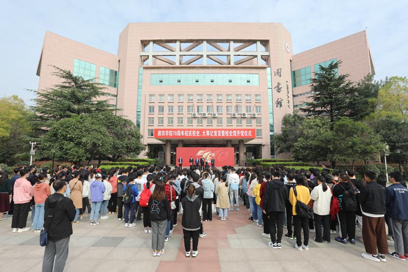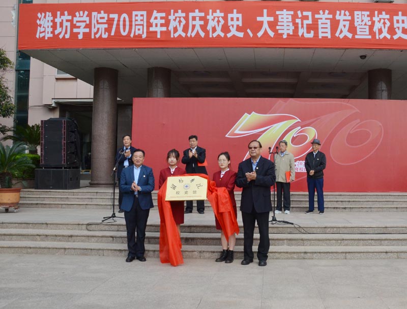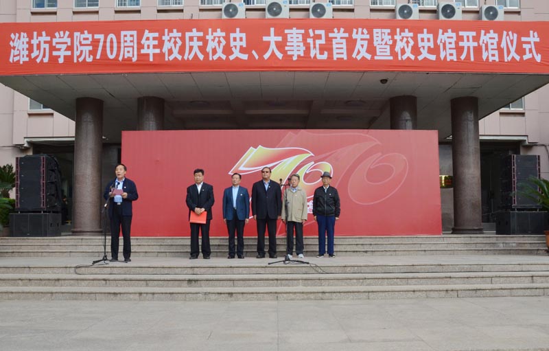 为回顾70年来办学成就,展示历代潍院人的光辉业绩,进一步传承潍院精神、鼓舞奋进新征程的昂扬斗志,学校组织编纂了《潍坊学院校史》(2016-2021)和《潍坊学院大事记》(2016-2021),并对校史馆进行了重新改造布展。王清明在致辞时,代表学校向各位老领导、老同志以及广大师生长期以来为学校建设作出的突出贡献表示崇高的敬意,向参与校史编览的老师们、同志们表示诚挚的感谢,向校史、大事记和校史馆顺利首发、开馆表示热烈的祝贺。