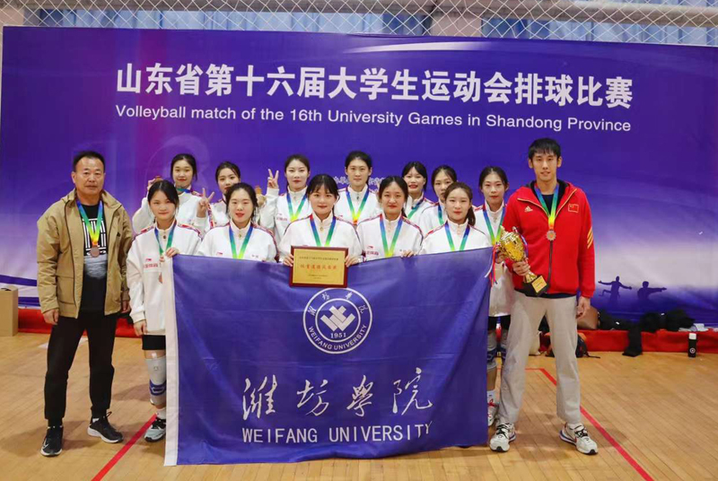 本网讯 山东省第十六届大学生运动会排球比赛10月27日落下帷幕,全省共有12支高校代表队参赛。我校女排连克包括山东大学、曲阜师范大学、山东建筑大学等传统强队在内的5支队伍,最终斩获铜牌。团队凭借顽强拼搏的作风被大会授予“体育道德风尚奖”,韩东荣获“优秀教练员”称号。