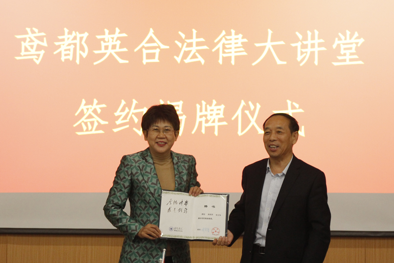 丁子信对出席活动的律师表示欢迎,并对他们为法学院提供的支持与帮助表示衷心的感谢。随后,高明芹与法学院负责同志签订《鸢都英合法律大讲堂合作共建协议》,丁子信和夏寿岩共同为“鸢都英合法律大讲堂”揭牌。高明芹代表鸢都英合律师事务所向法学院捐赠15万元。