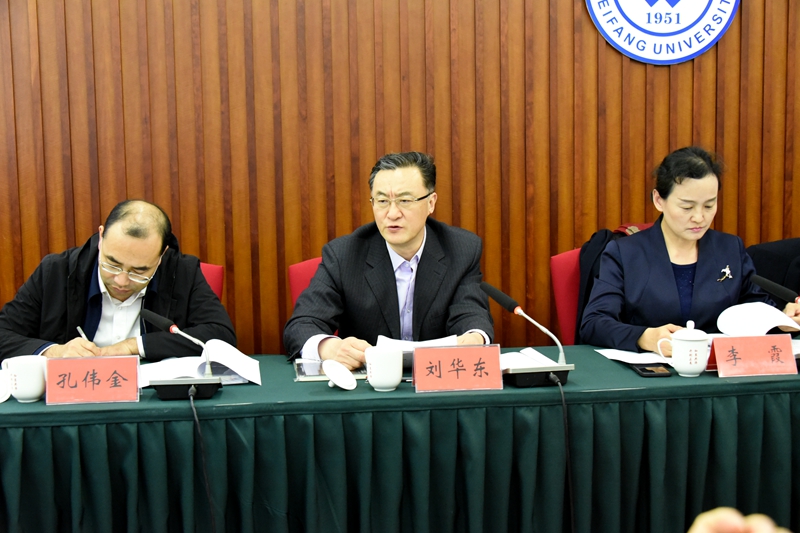 本网讯 12月10日,由中国石油大学(华东)主办,潍坊学院协办的“山东省普通本科高校专业结构优化研究”重大项目推进会在我校体育馆会议室召开。山东省教育厅高教处处长李霞,潍坊学院党委书记李东,省教育厅高教处副处长孙嘉斌,中国石油大学(华东)副校长刘华东,青岛大学副校长孔伟金,潍坊学院副校长赵光强等出席会议。项目组成员同来自山东大学、中国海洋大学、中国石油大学(华东)在内的11所高校专业建设工作相关人员参加会议。