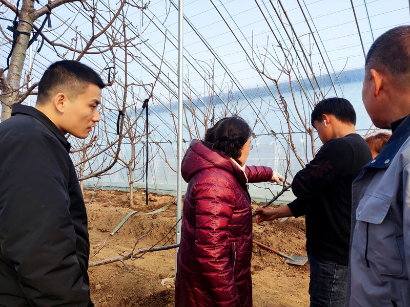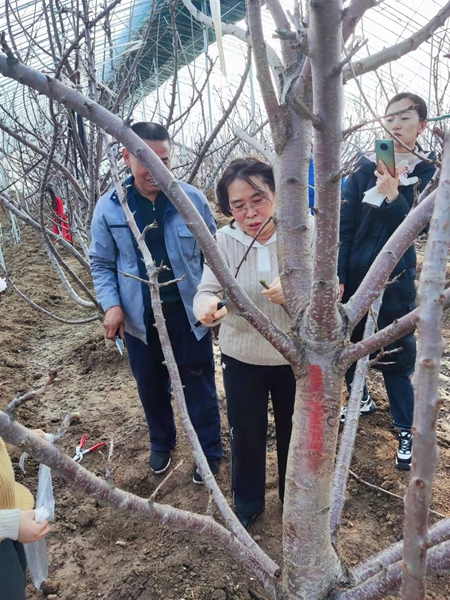 1月18日下午,曹慧教授又带领的科研团队来到潍坊经济开发区润鑫果蔬种植专业合作社,进行设施栽培樱桃树形修剪和花枝嫁接工作。