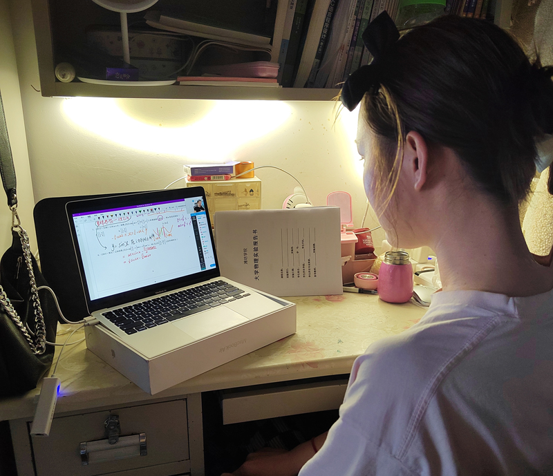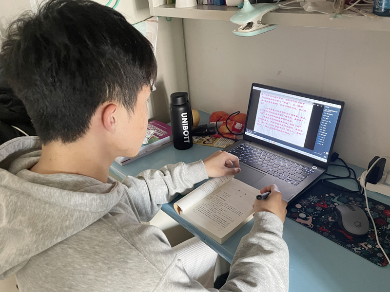 8点,学生宿舍内。同学们按时通过手机、电脑,开始了网上学习,一切井然有序。